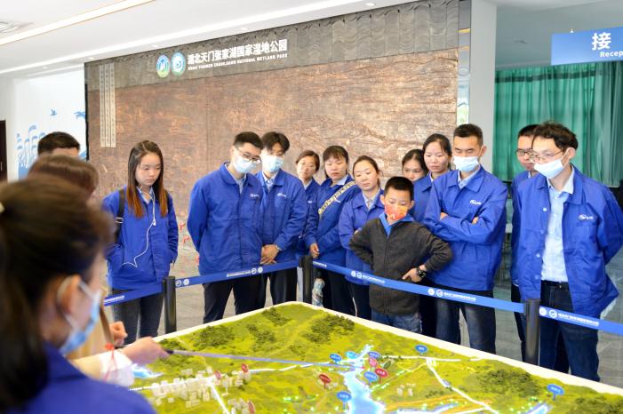 公司全體青年員工坐乘大巴車(chē)來(lái)到了張家湖國(guó)家濕地公園,它位于湖北省天門(mén)市九真鎮(zhèn),湖泊水域面積6.53平方公里,平均水深1.8米,是典型的淺水湖泊,其濕地類(lèi)型屬內(nèi)陸淡水湖泊,是天門(mén)市最大的湖泊,也是湖北省保持原始生態(tài)最好的湖泊之一。到上世紀(jì)二十年代,隨著湖區(qū)淤積、湖泊萎縮,西部形成張家湖,東部形成石家湖。到達(dá)目的地后,公園的工作人員進(jìn)行了熱情地接待,大家仿佛穿越到了原生態(tài)的農(nóng)耕時(shí)代,湖泊密布,半島羅列,河湖相通,一派水鄉(xiāng)澤國(guó)、湖光田園景象。來(lái)到觀鳥(niǎo)臺(tái),登高望遠(yuǎn),一覽張家湖美景和各種野生鳥(niǎo)類(lèi)。公園設(shè)有科普館,里面陳列了濕地的人文風(fēng)貌及天門(mén)的特色文化,還有各種攝影大片。