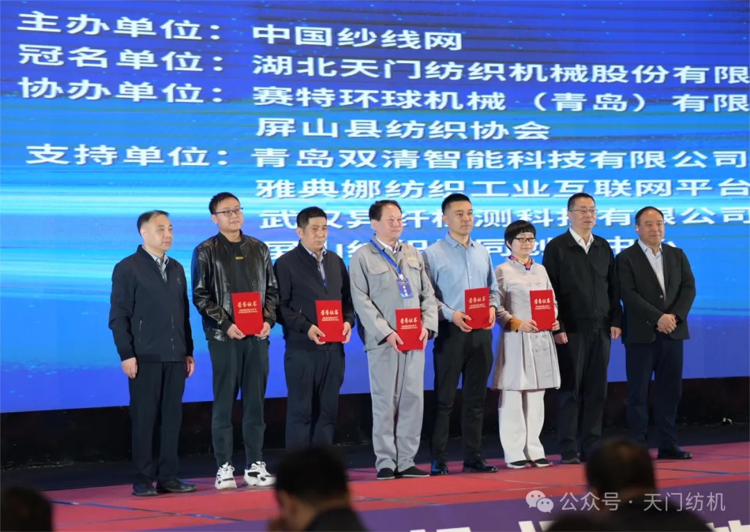 在領(lǐng)導和嘉賓致辭之后,舉行了“天門紡機杯”第12屆全國紡紗技術(shù)創(chuàng)新研討會論文頒獎活動。中國紡織機械協(xié)會會長顧平、中國紗線網(wǎng)總編王果剛、天門紡機總經(jīng)理焦倫進為獲獎作者頒獎。