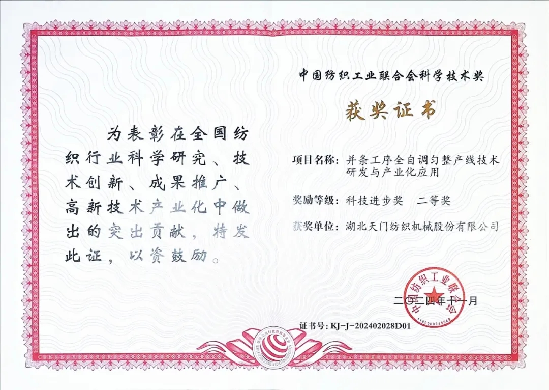 2024年11月12日,在北京人民大會(huì)堂召開(kāi)的2024年度中國(guó)紡織工業(yè)聯(lián)合會(huì)科學(xué)技術(shù)獎(jiǎng)勵(lì)大會(huì)傳來(lái)喜訊,由天門(mén)紡機(jī)主導(dǎo),武漢紡織大學(xué)、安徽華茂紡織股份有限公司、武漢銀橋南海光電有限公司等單位合作開(kāi)發(fā)的“并條工序全自調(diào)勻整產(chǎn)線技術(shù)研發(fā)與產(chǎn)業(yè)化應(yīng)用項(xiàng)目”獲得2024年“中國(guó)紡織工業(yè)聯(lián)合會(huì)科學(xué)技術(shù)獎(jiǎng)”科技進(jìn)步二等獎(jiǎng)。